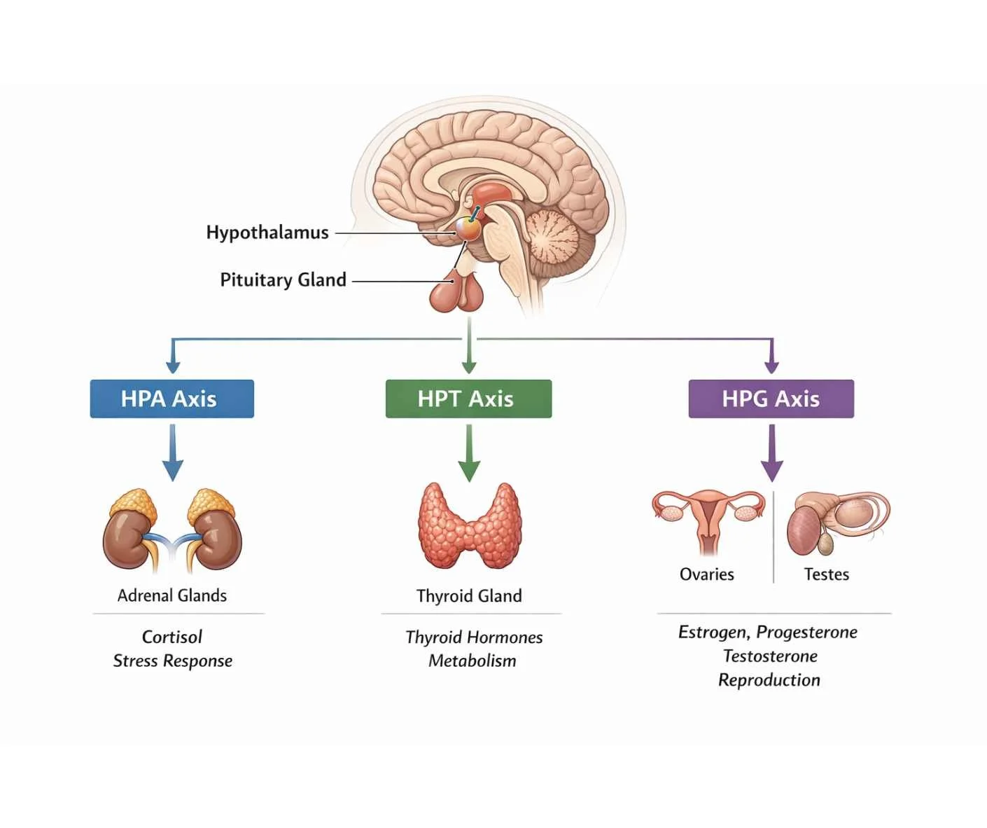 At the top of the endocrine hierarchy is the hypothalamus, which acts as a command center linking the nervous system to hormonal regulation. The hypothalamus receives continuous input from the autonomic nervous system, immune signaling, metabolic cues, and sensory perception (3).