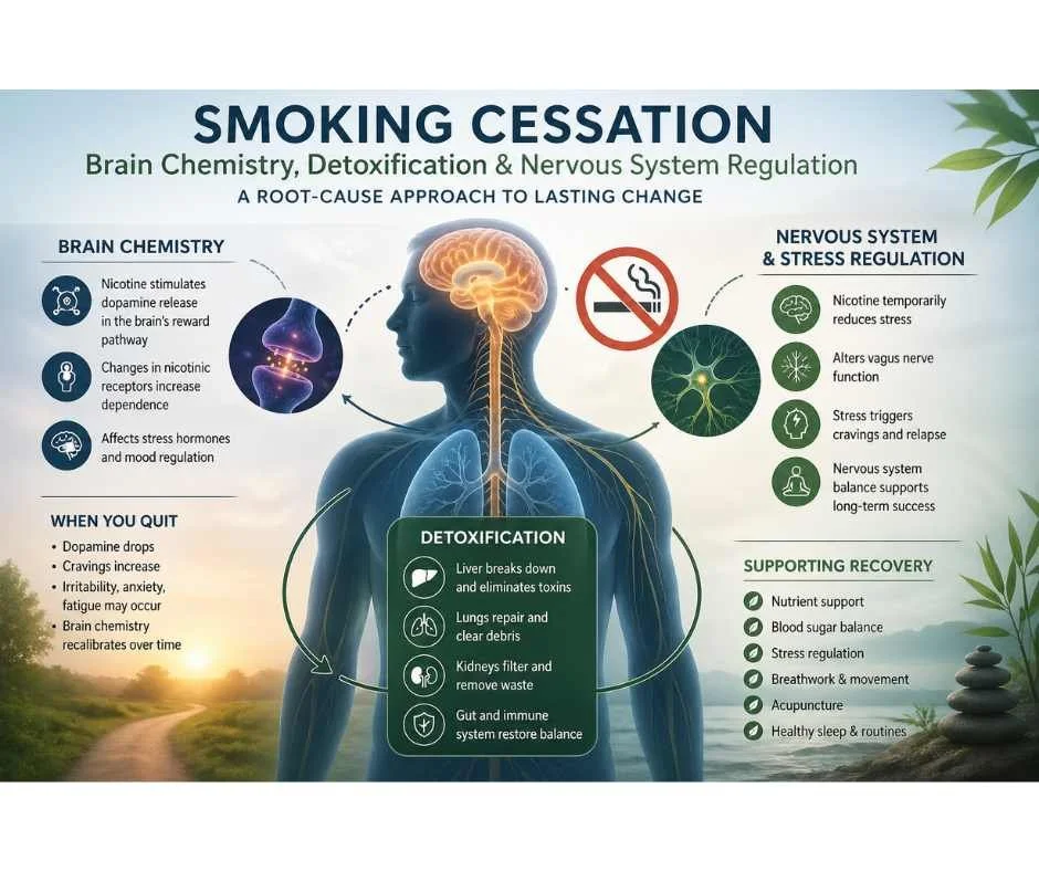 A systems-based, root-cause approach reframes smoking cessation entirely. Instead of focusing only on behavior, it examines how nicotine has interacted with the brain, liver, and nervous system—and what those systems need in order to restore balance. When these physiological drivers are supported, the process of quitting becomes more stable, predictable, and sustainable.